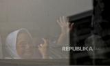 Jamaah haji melambaikan tangan di dalam bus di kompleks Asrama Haji Pondok Gede, Jakarta, Selasa (30/5/2023). (FOTO : Republika/Thoudy Badai)