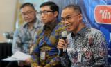 Direktur Utama BRI Life Iwan Pasila (kanan) bersama Direktur Operasional Yossie William Iroth (kiri), Direktur Pemasaran Sutadi (tengah) menyampaikan paparan Kinerja Kuartal I 2023 di Jakarta, Selasa (30/5/2023).  (FOTO : Republika/Putra M. Akbar)