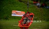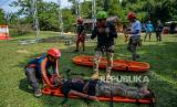 REPUBLIKA.CO.ID, SOREANG -- Tim Jabar Quick Response (JQR) memperagakan proses evakuasi pada sesi penyelamatan korban di ketinggian di Desa Sadu, Soreang, Kabupaten Bandung Jawa Barat, Selasa (30/5/2023).