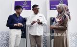 Head of Distribution & Network Management PT Bank Muamalat Indonesia Tbk Agung Prambudi (tengah) berbincang bersama karyawan yang selesai bertransaksi menggunakan kartu Shar-E Debit Muamalat di mesin ATM Muamalat Tower, Jakarta, Rabu (31/5/2023). Bank Muamalat memberikan kemudahan bagi jamaah haji yang ingin bertransaksi di tanah suci melalui fasilitas kartu Shar-E Debit Muamalat. Kartu Shar-E Debit Muamalat berlogo VISA ini dapat digunakan di mesin ATM berlogo VISA/Plus di Arab Saudi dan di mesin ATM milik Bank Al Rajhi yang tersebar di Makkah, Madinah dan Jeddah. Kelebihan dari kartu Shar-E Debit Muamalat ini adalah tersedia pilihan transaksi bahasa Indonesia saat bertransaksi di ATM. (FOTO : Republika/Edwin Dwi Putranto)