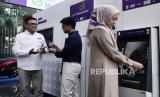 Head of Distribution & Network Management PT Bank Muamalat Indonesia Tbk Agung Prambudi (kiri) berbincang bersama karyawan yang selesai bertransaksi menggunakan kartu Shar-E Debit Muamalat di mesin ATM Muamalat Tower, Jakarta, Rabu (31/5/2023). Bank Muamalat memberikan kemudahan bagi jamaah haji yang ingin bertransaksi di tanah suci melalui fasilitas kartu Shar-E Debit Muamalat. Kartu Shar-E Debit Muamalat berlogo VISA ini dapat digunakan di mesin ATM berlogo VISA/Plus di Arab Saudi dan di mesin ATM milik Bank Al Rajhi yang tersebar di Makkah, Madinah dan Jeddah. Kelebihan dari kartu Shar-E Debit Muamalat ini adalah tersedia pilihan transaksi bahasa Indonesia saat bertransaksi di ATM. (FOTO : Republika/Edwin Dwi Putranto)
