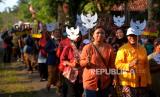 Warga mengikuti Kirab Garuda memperingati Hari Lahir Pancasila di Pedukuhan Kanutan, Bambanglipuro, Bantul, Yogyakarta, Kamis (1/6/2023). Kirab Garuda bersama warga masyarakat ini berkeliling desa dengan melewati Jalan Proklamasi, Jalan Garuda, Jalan Merdeka, dan Jalan Pancasila. Pada acara ini sekaligus juga mengenalkan Wayang Beber Pancasila, yang berisi sejarah dan nilai-nilai Pancasila. (FOTO : Republika/Wihdan Hidayat)