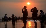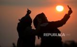 Wisatawan berswafoto saat senja di Pantai Parangtritis, Bantul, Yogyakarta, Kamis (1/6/2023). Libur panjang Hari Lahir Pancasila dan Hari Raya Waisak menjadi peluang bagi warga untuk berwisata ke Yogyakarta. Pantai Parangtritis masih menjadi salah satu tujuan utama wisatawan untuk menghabiskan waktu saat senja. Kepadatan wisatawan di Yogyakarta diprediksi terjadi hingga Ahad (4/6/2023) mendatang. (FOTO : Republika/Wihdan Hidayat)