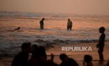 Wisatawan bermain air di Pantai Parangtritis, Bantul, Yogyakarta, Kamis (1/6/2023). Libur panjang Hari Lahir Pancasila dan Hari Raya Waisak menjadi peluang bagi warga untuk berwisata ke Yogyakarta. Pantai Parangtritis masih menjadi salah satu tujuan utama wisatawan untuk menghabiskan waktu saat senja. Kepadatan wisatawan di Yogyakarta diprediksi terjadi hingga Ahad (4/6/2023) mendatang. (FOTO : Republika/Wihdan Hidayat)