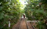 Pekerja memanen buah anggur di Jogja Anggur, Bantul, Yogyakarta, Kamis (1/6/2023). Selain menjual bibit tanaman anggur, di sini pengunjung juga dapat belajar edukasi tentang tanaman anggur. Harga setiap bibit tanaman anggur dijual dengan harga Rp 150 ribu untuk usia sekitar dua bulan. Berbagai jenis bibit tanaman anggur yang dijual misalnya jenis Dixon, Everest, Ninel, dan yang paling laris saat ini Tamaki. Untuk penjualan bibit tanaman anggur ini sudah menjangkau seluruh Indonesia. (FOTO : Republika/Wihdan Hidayat)