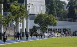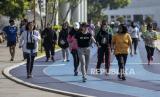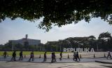 Warga berolahraga di Lapangan Gasibu, Jalan Diponegoro, Kota Bandung, Jawa Barat, Jumat (2/6/2023). Kawasan Gasibu yang kerap menjadi area wisata dan tempat sarana olahraga bagi warga terlihat ramai dikunjungi pada momen libur panjang Hari Raya Waisak. (FOTO : ABDAN SYAKURA/REPUBLIKA)