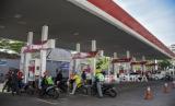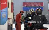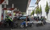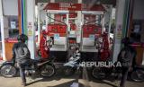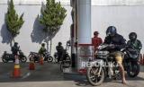 REPUBLIKA.CO.ID,BANDUNG -- Sejumlah pengendara sepeda motor antre untuk mengisi bahan bakar minyak (BBM) di SPBU Pertamina Riau, Jalan LLRE Martadinata, Kota Bandung, Jawa Barat, Jumat (2/6/2023).