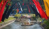 Penjual buah-buahan menggunakan gethek atau bambu apung saat Festival Van Der Wijck di Banyurejo, Sleman, Yogyakarta, Jumat (2/6/2023). Festival Van Der Wijck yang kedua ini menggabungkan potensi kanal irigasi, pertanian, dan sosial budaya masyarakat. Tema festival pada tahun ini yakni rice for all. Tema ini sebagai wujud apresiasi atas keberadaan saluran irigasi Van Der Wijck yang selama ini mendukung keberlangsungan pertanian di Sleman bagian Barat yang mampu menjaga ketahanan pangan. Berbagai acara budaya disiapkan panitia pada acara yang berlangsung hingga Ahad (3/6/2023). (FOTO : Republika/Wihdan Hidayat)
