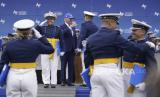 Para kadet merayakan setelah menerima diploma dari Presiden Joe Biden pada Upacara Wisuda Akademi Angkatan Udara (FOTO : AP Photo/Andrew Harnik)