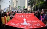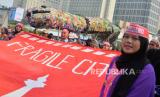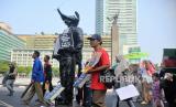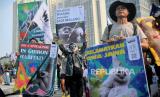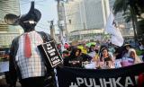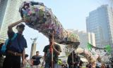 Sejumlah massa aksi dari berbagai elemen membawa ular yang terbuat dari sampah plastik saat melaksanakan unjuk rasa di kawasan Bundaran HI, Jakarta, Ahad (4/6/2023). Aksi bertepatan dalam rangka hari lingkungan hidup sedunia tersebut menuntut pemerintah untuk segera mengambil tindakan terkait permasalahan krisis iklim di Indonesia. (FOTO : Republika/Putra M. Akbar)