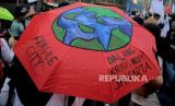 Massa aksi memakai payung bergambar bumi saat melaksanakan unjuk rasa di kawasan Bundaran HI, Jakarta, Ahad (4/6/2023). Aksi bertepatan dalam rangka hari lingkungan hidup sedunia tersebut menuntut pemerintah untuk segera mengambil tindakan terkait permasalahan krisis iklim di Indonesia. (FOTO : Republika/Putra M. Akbar)