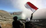 Pengunjung mengibarkan bendera Merah Putih di Taman Wisata Alam (TWA) Ijen Banyuwangi, Jawa Timur, Ahad (4/5/2023). TWA Ijen yang telah ditetapkan sebagai anggota UNESCO Global Geopark (UGG) itu ramai dikunjungi wisatawan domestik dan mancanegara saat liburan. (FOTO : ANTARA FOTO/Budi Candra Setya)