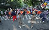 Sejumlah petugas Satpol PP dan Dishub Kota Bandung berjaga disejumlah persimpangan saat Car Free Day (CFD) yang kembali digelar di kawasan dago atau Jalan Ir H Djuanda, Ahad (4/6/2023). Diketahui, kegiatan CFD sudah tiga tahun lebih ditiadakan akibat pandemi Covid-19. Pemerintah kota (Pemkot) dan instansi terkait pun akan terus melakukan evaluasi atas kegiatan CFD, dan tidak menutup kemungkinan, kegiatan CFD akan diadakan pula di ruas jalan lainnya di Kota Bandung. (FOTO : Edi Yusuf/Republika)