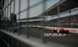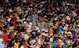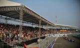 Warga menonton pertandingan balapan Formula E 2023 seri 11 di Jakarta International E-Prix Circuit. (FOTO : Republika/Putra M. Akbar)