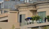 Warga menonton pertandingan balapan Formula E 2023 seri 11 dari rumahnya. (FOTO : Republika/Putra M. Akbar)