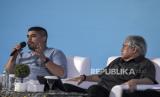 Penulis buku (Bukan) Kisah Sukses Erick Thohir Abdullah Sammy (kiri) bersama Pemerhati Olahraga Fritz E Simandjuntak (kanan) menjadi narasumber dalam Bedah Buku (Bukan) Kisah Sukses Erick Thohir di Telkom University, Kabupaten Bandung, Jawa Barat, Senin (5/6/2023). Buku biografi tersebut menceritakan perjalanan hidup dan penggalan-penggalan kisah Erick Thohir sejak masa sekolah, sebagai seorang pengusaha, pimpinan media, penggemar olahraga, hingga menjadi pejabat publik sebagai Menteri BUMN saat ini. (FOTO : ABDAN SYAKURA/REPUBLIKA)