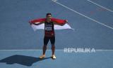 REPUBLIKA.CO.ID, PHNOM PENH -- Pelari putra Indonesia Nur Ferry Pradana berpose seusai menjuarai final 100 M T47 ASEAN Para Games 2023 di Morodok Techo National Stadium, Phnom Penh, Kamboja, Senin (5/6/2023).