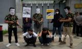 Sejumlah massa yang tergabung dalam Aliansi Mahasiswa Islam (AMI) melakukan teaterikal saat aksi unjuk rasa di depan Kedutaan Besar China, Jakarta, Senin (5/6/2023). Dalam aksinya mereka meminta pemerintah China untuk bertanggung jawab atas tewasnya 10.000 warga negaranya, dan mengajak negara-negara dunia untuk menyeret seluruh aktor intelektual serta otak dalam tragedi berdarah Tiananmen ke Mahkmah Internasional. (FOTO : Republika/Prayogi)