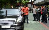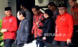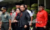 Ketua DPP PDIP Puan Maharani bersama Ketua DPP PDIP Prananda Prabowo dan Bakal Calon Presiden PDIP Ganjar Pranowo mengantar Presiden Joko Widodo usai enghadiri Rakernas III PDI Perjuangan di Sekolah Partai DPP PDIP, Jakarta, Selasa (6/6/2023). Rakernas PDI Perjuangan yang berlangsung 6-8 Juni 2023 itu mengangkat tema fakir miskin dan anak-anak terlantar dipelihara oleh negara. (FOTO : Republika/Prayogi)
