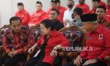 Presiden Joko Widodo (tengah) berbincang dengan Ketua DPP PDIP Puan Maharani (empat kanan), Ketua DPP PDIP Prananda Prabowo (dua kiri) dan Bakal Calon Presiden PDIP Ganjar Pranowo (kiri) usai menghadiri Rakernas III PDI Perjuangan di Sekolah Partai DPP PDIP, Jakarta, Selasa (6/6/2023). Rakernas PDI Perjuangan yang berlangsung 6-8 Juni 2023 itu mengangkat tema fakir miskin dan anak-anak terlantar dipelihara oleh negara. (FOTO : Republika/Prayogi)