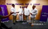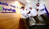Dirut PT Bank Muamalat Indonesia Tbk Indra Falatehan (kiri) didampingi oleh Dir Op dan Digital Wahyu Avianto (kanan) melepas calon jamaah haji dari Bank Muamalat di Jakarta, Selasa (6/6). (FOTO : Republika/Yogi Ardhi)