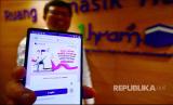 Dirut PT Bank Muamalat Indonesia Tbk Indra Falatehan menunjukkan tampilan Muamalat DIN calon jamaah haji dari Bank Muamalat di Ruang Manasik Haji dan Umrah, Muamalat Tower, Jakarta, Selasa (6/6). (FOTO : Republika/Yogi Ardhi)