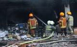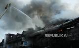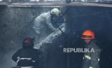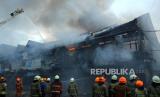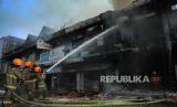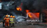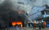 Petugas pemadam kebakaran berupaya memadamkan api saat kebakaran ruko di Pasar Caringin, Kota Bandung, Rabu (7/6/2023). Penyebab kebakaran masih dalam penyelidikan. Hingga sore, proses pemadaman masih berlangsung. (FOTO : Edi Yusuf/Republika)