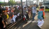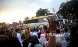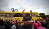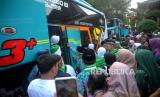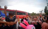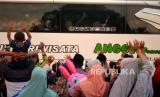 Jamaah calon haji kloter 48 ke lokasi pemberangkatan menuju Embarkasi Solo di Pendopo Parasamya Bantul, Yogyakarta, Rabu (7/6/2023). Sebanyak 360 orang yang terdiri dari 353 jamaah calon haji dari kelompok bimbingan ibadah haji (KBIH) Aisiyah serta 7 petugas asal Kabupaten Bantul yang tergabung dalam kloter 48 dilepas menuju Embarkasi Solo. Kloter 48 ini termasuk dalam pemberangkatan ibadah haji gelombang kedua yang akan mendarat di Jeddah. (FOTO : Republika/Wihdan Hidayat)