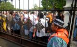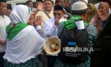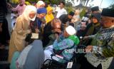 Petugas membantu jamaah calon haji kloter 48 menuju Embarkasi Solo di Pendopo Parasamya Bantul, Yogyakarta, Rabu (7/6/2023). Sebanyak 360 orang yang terdiri dari 353 jamaah calon haji dari kelompok bimbingan ibadah haji (KBIH) Aisiyah serta 7 petugas asal Kabupaten Bantul yang tergabung dalam kloter 48 dilepas menuju Embarkasi Solo. Kloter 48 ini termasuk dalam pemberangkatan ibadah haji gelombang kedua yang akan mendarat di Jeddah. (FOTO : Republika/Wihdan Hidayat)