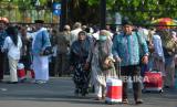 REPUBLIKA.CO.ID,YOGYAKARTA -- Keluarga membawa koper jamaah calon haji saat keberangkatan kloter 48 menuju Embarkasi Solo di Pendopo Parasamya Bantul, Yogyakarta, Rabu (7/6/2023).