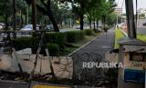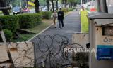 Kawat berduri menutup akses trotoar di depan Kedutaan Besar Amerika Serikat di Jalan Medan Merdeka Selatan, Jakarta Pusat, Rabu (7/6/2023). Pemprov DKI Jakarta memastikan bakal melakukan pembukaan blokade trotoar di depan Kedubes Amerika Serikat usai melakukan pembahasan bersama pihak terkait diantaranya pihak Kementerian Luar Negeri, Kedubes Amerika Serikat, serta Direktorat Pengamanan Objek Vital Polda Metro Jaya. Namun Pemprov DKI belum bisa memastikan kapan waktu pembukaannya. Sebelumnya Kedubes AS melalui juru bicaranya mengungkapkan bahwa aksesibilitas, keamanan dan walkability merupakan faktor pertimbangan penting untuk kota besar seperti Jakarta sehingga rencana pembukaan trotoar di depan Kedubes AS disambut dengan baik. (FOTO : Republika/Thoudy Badai)