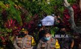 REPUBLIKA.CO.ID, BANYUMAS -- Polisi mengawal ambulans pembawa jenazah usai penggalian makam tersangka pencurian motor yang tewas dalam tahanan Polresta Banyumas, di TPU Desa Purwosari, Baturraden, Banyumas, Jateng, Kamis (8/6/2023).