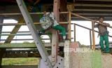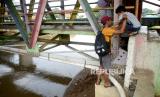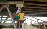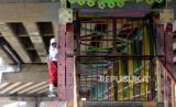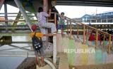 REPUBLIKA.CO.ID, KALIBATA -- Warga berusaha melompati jembatan penyeberangan orang (JPO) Kali Ciliwung yang ditutup di kawasan kolong Flyover Rawajati, Kalibata, Jakarta, Kamis (8/6/2023).
