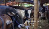 REPUBLIKA.CO.ID, CIPAMOKOLAN -- Pekerja memberi pakan hewan kurban di salah satu tempat penjualan hewan kurban di Jalan Soekarno Hatta, Cipamokolan, Kota Bandung, Jawa Barat, Kamis (8/6/2023).