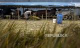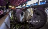 Pekerja memberi pakan hewan qurban di salah satu tempat penjualan hewan qurban di Jalan Soekarno Hatta, Cipamokolan, Kota Bandung, Jawa Barat, Kamis (8/6/2023). Dinas Ketahanan Pangan dan Peternakan (DKPP) Jawa Barat menyebutkan kebutuhan hewan qurban di Jawa Barat pada Hari Raya Idul Adha diperkirakan mencapai 260 ribu ekor. Sementara stok ketersediaan hewan qurban mulai dari sapi, kambing, domba dan kerbau di Jawa Barat sebanyak 500 ribu ekor. (FOTO : ABDAN SYAKURA/REPUBLIKA)