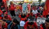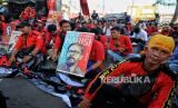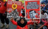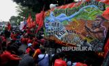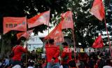 Massa dari elemen buruh saat menggelar aksi di depan gedung Pengadilan Negeri saat sidang lanjutan terdakwa Direktur Eksekutif Lokataru Haris Azhar dan terdakwa Kordinator KontraS Fatia Maulidiyanti di Jakarta, Kamis (8/6/2023). Sejumlah massa aksi berkumpul di depan gedung PN Jaktim sebagai bentuk dukungan dan solidaritas terhadap terdakwa Haris Azhar dan Fatia atas kasus dugaan pencemaran nama baik terhadap Menko Marves Luhut Binsar Pandjaitan dalam unggahan pada akun youtube milik Haris Azhar dengan judul Ada Lord Luhut di Balik Relasi Ekonomi-Ops Militer Intan Jaya!! Jenderal BIN Juga Ada!! yang diunggah pada Agustus 2021 lalu. (FOTO : Republika/Thoudy Badai)