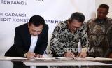Plt Direktur Utama PT Bank Pembangunan Daerah Sumatera Utara Tbk (BSMT) Hadi Sucipto (kiri) dan Direktur Operasional PT Askrindo Erwan Djoko Hermawan melakukan Penandatanganan Perjanjian Kerja Sama Antara PT Asuransi Kredit Indonesia dengan PT Bank Pembangunan Daerah Sumatera Utara Tbk (BSMT) tentang PKS Induk, PKS Kontra Bank Garansi dan PKS Asuransi Kredit Konstruksi dan non Konstruksi di Jakarta, Kamis (8/6/2023). PT Askrindo akan terus meningkatkan kolaborasi dengan mitra-mitra perbankan lainnya untuk membangun ekosistem BUMN yang sehat dan memiliki daya saing yang kuat, serta memberikan perlindungan bagi para pemegang polis, dan mendorong perekonomian nasional. (FOTO : Republika/Edwin Dwi Putranto)