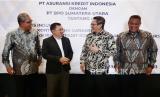 Direktur Operasional Asosiasi Bank Pembangunan Daerah (Asbanda) Subekti Heriyanto, Plt Direktur Utama PT Bank Pembangunan Daerah Sumatera Utara Tbk (BSMT) Hadi Sucipto, Direktur Operasional PT Askrindo Erwan Djoko Hermawan, dan SEVP Bisnis PT Askrindo Barly Surachman Yusuf (dari kiri) berfoto bersama usai Penandatanganan Perjanjian Kerja Sama Antara PT Asuransi Kredit Indonesia dengan PT Bank Pembangunan Daerah Sumatera Utara Tbk (BSMT) tentang PKS Induk, PKS Kontra Bank Garansi dan PKS Asuransi Kredit Konstruksi dan non Konstruksi di Jakarta, Kamis (8/6/2023). PT Askrindo akan terus meningkatkan kolaborasi dengan mitra-mitra perbankan lainnya untuk membangun ekosistem BUMN yang sehat dan memiliki daya saing yang kuat, serta memberikan perlindungan bagi para pemegang polis, dan mendorong perekonomian nasional. (FOTO : Republika/Edwin Dwi Putranto)
