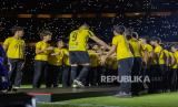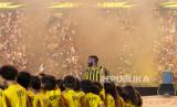 Pemain sepak bola Prancis Karim Benzema berjalan saat penyambutan setelah bergabung dengan Al Ittihad, di Jeddah, Arab Saudi, Jumat (9/6/2023). Pesta kembang api, kerlap-kerlip lampu, puluhan ribu suporter hadir dan bergemuruh menjadi pemandangan menarik dalam acara penyambutan Benzema di Stadion King Abdullah Sports City. (FOTO : EPA)
