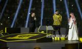 Pemain sepak bola Prancis Karim Benzema melakukan sesi tanja jawab dalam acara penyambutan setelah bergabung dengan Al Ittihad, di Jeddah, Arab Saudi, Jumat (9/6/2023). Dia juga memamerkan trofi Ballon d (FOTO : EPA)