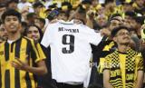 Penggemar sepak bola Saudi Al Ittihad menunjukkan kaos pemain tim mereka Karim Benzema saat upacara penyerahan di Stadion King Abdullah Sports City di Jeddah, Arab Saudi, Jumat (9/6/2023). (FOTO : AP)