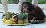 Orang utan Kalimantan (Pongo Pygmaeus) bernama Nadia memakan buah-buahan yang diberikan petugas saat pertunjukan satwa di Solo Safari, Kota Solo, Jawa Tengah, Jumat (9/6/2023). Kegiatan tersebut digelar untuk merayakan HUT ke-6 orang utan Nadia koleksi Solo Safari. (FOTO : Antara/Maulana Surya)