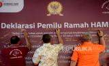 Tamu undangan turut melakukan Penandatanganan Deklarasi Pemilu Ramah Hak Asasi Manusia (HAM) di Kantor Komnas HAM, Jakarta, Ahad (11/6/2023). (FOTO : Republika/Prayogi)