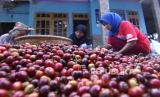 Sejumlah pekerja menyortir buah kopi di Gombengsari, Banyuwangi, Jawa Timur, Ahad (11/6/2023). (FOTO : ANTARA FOTO/BUDI CANDRA SETYA)
