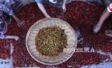 REPUBLIKA.CO.ID, BANYUWANGI -- Sejumlah pekerja menyortir buah kopi di Gombengsari, Banyuwangi, Jawa Timur, Ahad (11/6/2023). Menurut petani, kebun seluas 1,5 hektare miliknya diperkirakan hanya mampu menghasilkan delapan kuintal biji kopi jenis robusta tahun ini atau mengalami penurunan hasil panen jika dibandingkan tahun sebelumnya, yakni satu ton kopi akibat perubahan cuaca.