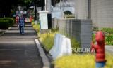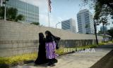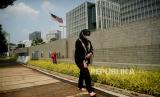 REPUBLIKA.CO.ID, JAKARTA -- Pejalan kaki melintas di trotoar di depan Kedutaan Besar Amerika Serikat, Jalan Merdeka Selatan, Jakarta, Ahad (11/6/2023).