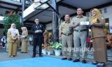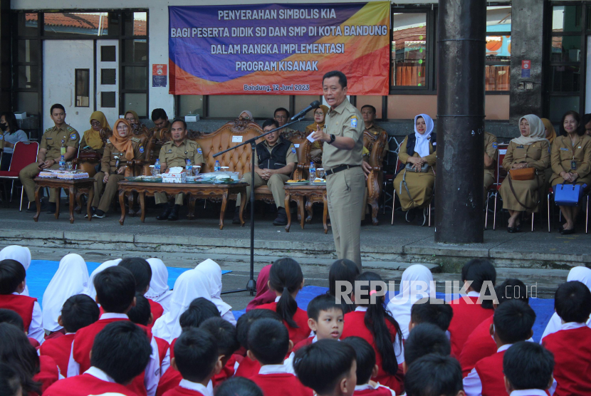 Plh Wali Kota Bandung Ema Sumarna menyampaikan sambutan saat penyerahan secara simbolis Kartu Identitas Anak (KIA) usai acara Penyerahan Kartu Identitas Anak Bagi 22 SD dan SMP di Kota Bandung, di SD Negeri 001 Merdeka, Jalan Merdeka, Kota Bandung, Senin (12/6). Kegiatan tersebut merupakan implementasi Kisanak (KIA kerja sama dengan Sekolah Anak). Kisanak merupakan inovasi akselerasi penerbitan KIA secara kolektif di sekolah-sekolah kerja sama dengan Dinas Pendidikan Kota Bandung. Kepemilikan KIA terus disosialisasikan, salah satunya untuk mengoptimalkan pendataan, perlindungan, dan pelayanan publik secara mandiri. (FOTO : Edi Yusuf/Republika)