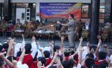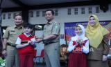 Plh Wali Kota Bandung Kartu Ema Sumarna secara simbolis menyerahkan Kartu Identitas Anak (KIA) pada acara Penyerahan Kartu Identitas Anak Bagi 22 SD dan SMP di Kota Bandung, di SD Negeri 001 Merdeka, Jalan Merdeka, Kota Bandung, Senin (12/6). Kegiatan tersebut merupakan implementasi Kisanak (KIA kerja sama dengan Sekolah Anak). Kisanak merupakan inovasi akselerasi penerbitan KIA secara kolektif di sekolah-sekolah kerja sama dengan Dinas Pendidikan Kota Bandung. Kepemilikan KIA terus disosialisasikan, salah satunya untuk mengoptimalkan pendataan, perlindungan, dan pelayanan publik secara mandiri. (FOTO : Edi Yusuf/Republika)