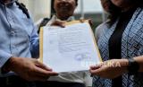 Komisioner KPK periode 2015-2019 Saut Situmorang (kiri) bersama perwakilan Indonesia Corruption Watch (ICW) dan Koalisi Masyarakat Sipil Kawal Pemilu Bersih menunjukan surat tanda penerimaan berkas perkara uji materi di Gedung Mahkamah Agung Republik Indonesia, Jakarta, Senin (12/6/2023). Koalisi Masyarakat Sipil Kawal Pemilu Bersih bersama Indonesia Corruption Watch (ICW) dan Komisioner KPK 2015-2019 Saut Situmorang mengajukan uji materi Peraturan Komisi Pemilihan Umum Nomor 10 dan 11 Tahun 2023 ke Mahkamah Agung. ICW menilai dalam peraturan tersebut KPU memberikan celah kepada para koruptor untuk maju dalam kontestasi pemilu legislatif. (FOTO : Republika/Thoudy Badai)