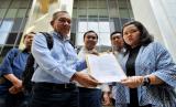 Komisioner KPK periode 2015-2019 Saut Situmorang (kedua kiri) bersama perwakilan Indonesia Corruption Watch (ICW) dan Koalisi Masyarakat Sipil Kawal Pemilu Bersih menunjukan surat tanda penerimaan berkas perkara uji materi di Gedung Mahkamah Agung Republik Indonesia, Jakarta, Senin (12/6/2023). Koalisi Masyarakat Sipil Kawal Pemilu Bersih bersama Indonesia Corruption Watch (ICW) dan Komisioner KPK 2015-2019 Saut Situmorang mengajukan uji materi Peraturan Komisi Pemilihan Umum Nomor 10 dan 11 Tahun 2023 ke Mahkamah Agung. ICW menilai dalam peraturan tersebut KPU memberikan celah kepada para koruptor untuk maju dalam kontestasi pemilu legislatif. (FOTO : Republika/Thoudy Badai)